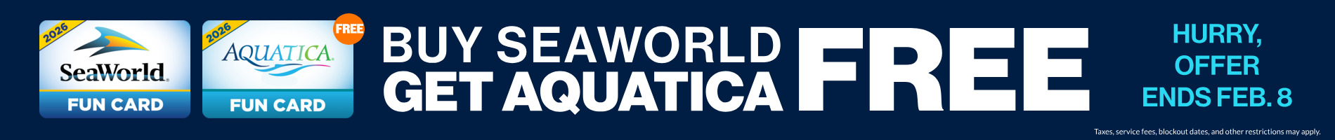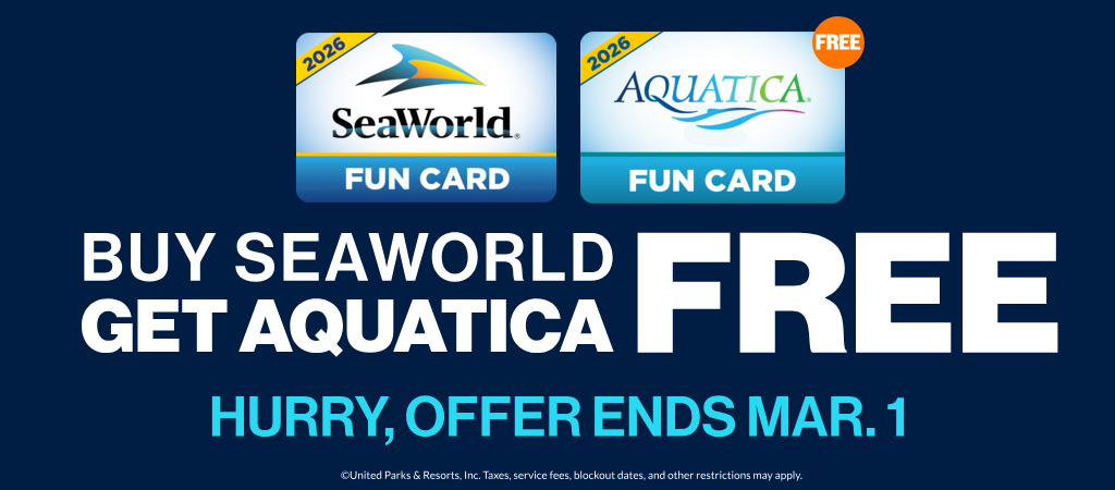 Parking, service fees, and taxes not included. 2026 Fun Card valid through December 31, 2026 at SeaWorld and Aquatica Orlando. Only valid for residents of the United States, Canada, and Puerto Rico. Fun Card does not include admission to select special events or discounts on food and merchandise. Non-transferable and non-refundable. Not valid with any other discounts or special offers. Other restrictions may apply. Subject to change without prior notice. Savings based on the cost of an individual SeaWorld Orlando and Aquatica Orlando Fun Card. Online savings are based on general admission prices available at the park. The eTicket must be purchased prior to arrival.